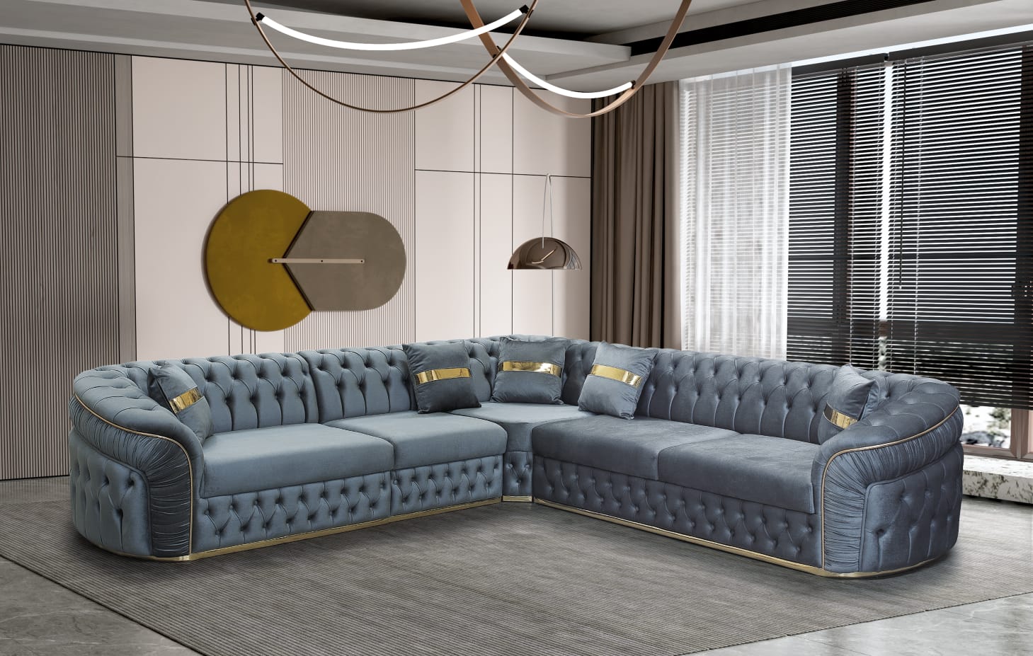 Design Personalizat: Tapițeria este disponibilă în culori și texturi multiple, inclusiv catifea. Colțarele pot fi configurate pe dimensiuni standard sau personalizate (cost suplimentar 100 lei pentru fiecare 10 cm adăugați), pentru a se plia perfect nevoilor tale.